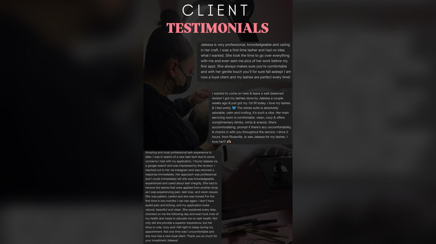 Hi, I’m Jaleesa and I’m so GRATEFUL you’re here! 💗From the moment you walk in to my lash studio, my goal is to make you feel completely at ease. I’ll greet you with a smile, take your things, and make sure you’re comfortable before we even start your service. I want you to feel cared for, not rushed. This is your time to unwind, exhale, and just BE.I’m a lash salon in San Ramon offering fully customized lash extensions designed to enhance your features. As a licensed San Ramon lash artist, I specialize in eyelash extensions including wispy lashes, natural lashes, hybrid, and volume styles that complement your features while protecting lash health. At my cozy San Ramon lash salon, every set is created with care, comfort, and connection in mind. My goal is to give you the best lashes for beauty that feels like you. 💗Every appointment starts with a real conversation. I take time to understand what YOU want, what you’ve experienced before, and how you want to feel when you leave. I’ll walk you through each step so you always know what’s happening, and I’ll never compromise the health of your natural lashes, ever.I don’t just slap lashes on and send you out the door. Every set is customized with care, using the right weight and design to enhance your natural lashes, not damage them. I’ll teach you how to care for them, what to avoid, and how to make them last so you always wake up feeling confident and put together.I check in after your appointment and want you to always feel comfortable sharing how they feel or if you’d like to try something new next time.This isn’t an in-and-out service. It’s a connection. A space to feel safe, seen, and valued. When you’re here, you’re my number one PRIORITY.Your time here isn’t just about lashes, it’s about relaxation, confidence, and leaving feeling lighter than when you came in.