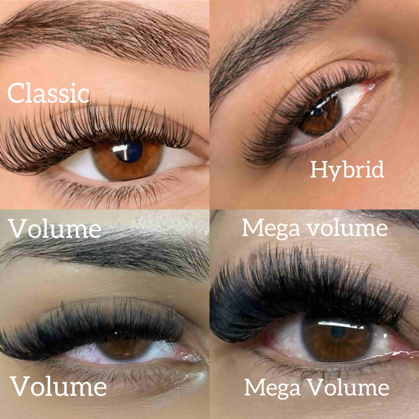 Classic: One extension is placed on one natural lash. This gives a clean, natural look like wearing mascara without the clumps or smudges. Great if you want subtle enhancementHybrid: A mix of natural-looking lashes and fuller lashes. It’s the “in-between” look more textured and noticeable than classic, but not as full as volume. Perfect if you can’t decide between natural and fullWet Set/Angel Set: This style gives your lashes a clean, glossy look like that “just washed” effect. It’s light, separated, and perfect if you like texture without too much fullness.Volume: Several very light extensions are placed on each natural lash to create a soft, fluffy, and full lash line. This style makes your eyes pop while still looking lightweightMega Volume: The boldest, darkest, and most dramatic look. Lots of tiny lightweight extensions are placed on each lash, creating maximum fullness